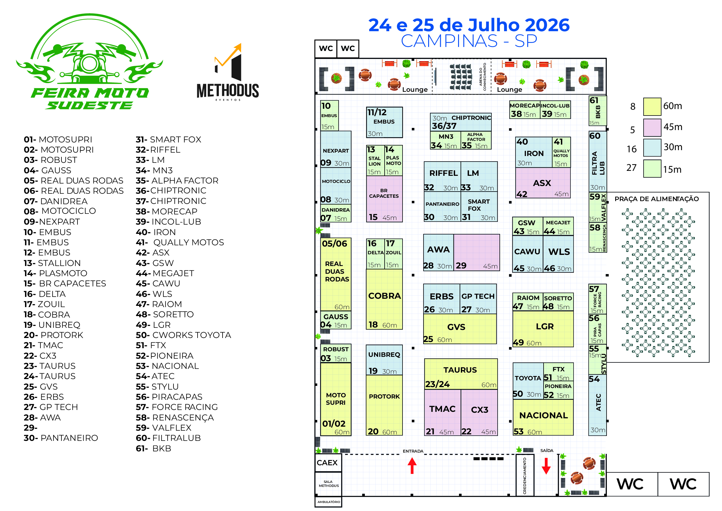 Mais de 60 estandes distribuídos em área privilegiada no Expo D. Pedro — Campinas/SP. Espaços planejados para maximizar visibilidade e fluxo de visitantes.